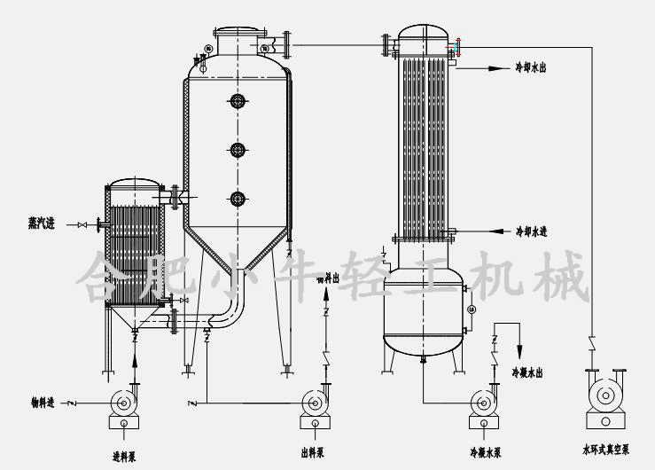 單效外循環(huán)蒸發(fā)器(單效濃縮器)主要由加熱器、分離器、冷凝器、冷凝水罐、冷凝水泵、真空泵、物料泵、電控系統(tǒng)、管路系統(tǒng)幾部分組成。主要部件均采用304、316L、2205等優(yōu)質(zhì)不銹鋼材料制成。