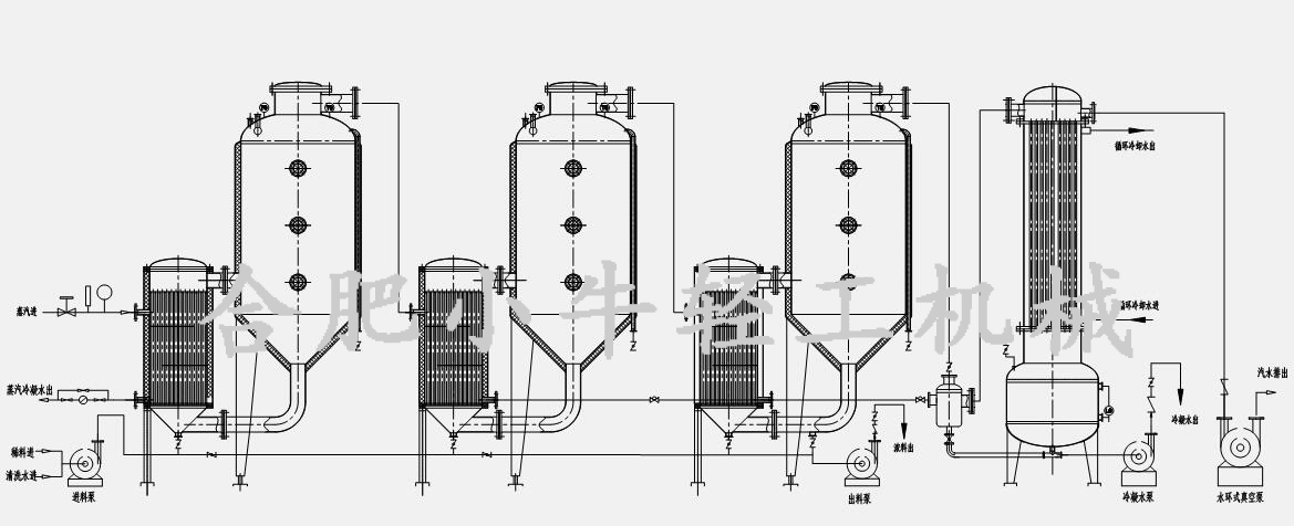 三效外循環(huán)蒸發(fā)器主要組成部件有第一效加熱器、第二效加熱器、第三效加熱器、第一效分離器、第二效分離器、第三效分離器、冷凝器、冷凝水罐、真空泵、料液泵、閥門(mén)管路系統(tǒng)、電控系統(tǒng)等。設(shè)備在運(yùn)行時(shí),料液通過(guò)泵送或真空自吸原理進(jìn)入各效加熱器及各效分離器的管程,加熱介質(zhì)(鍋爐蒸汽)進(jìn)入第一效加熱器的殼程,料液在真空狀態(tài)下沸點(diǎn)降低,當(dāng)受熱到一定溫度后開(kāi)始沸騰,并從噴射管?chē)娙敕蛛x器,進(jìn)行快速蒸發(fā)和汽液分離,未被蒸發(fā)的料液從底部循環(huán)管回流到加熱器再次噴入分離器,形成循環(huán)。由一效加熱器產(chǎn)生的二次蒸汽進(jìn)入二效加熱器殼程,作為第二效加熱器的加熱介質(zhì),同理第二效的二次蒸汽作為第三效加熱器的加熱介質(zhì),熱能得到充分利用,從而實(shí)現(xiàn)節(jié)能效果。最后的蒸汽進(jìn)入冷凝器,被冷卻循環(huán)水換熱冷凝成液相,進(jìn)入冷凝水收集罐,最后排出。第二效、第三效的物料運(yùn)動(dòng)狀態(tài)與第一效同理,當(dāng)料液縮到一定的程度,經(jīng)取樣確定合格后即可出料,完成蒸發(fā)濃縮過(guò)程。