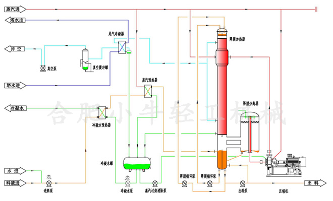降膜蒸發(fā)器的料液是從蒸發(fā)器的頂部加入,在重力作用下沿管壁成膜狀下降,并在通過加熱管的過程中被蒸發(fā)增濃,在其底部得到濃縮液。MVR降膜蒸發(fā)器將加熱器的產生的二次蒸汽通過壓縮機的絕熱壓縮,能量進行壓縮提升,使其壓力、溫度提高后,再作為加熱蒸汽送入蒸發(fā)器的加熱室,冷凝放熱,使其對這壓縮過后的二次蒸汽加以利用,將其二次蒸汽內部潛熱進行回收。因二次蒸汽的潛熱得到了回收利用,所以該設備具有節(jié)省能耗的顯著特點。