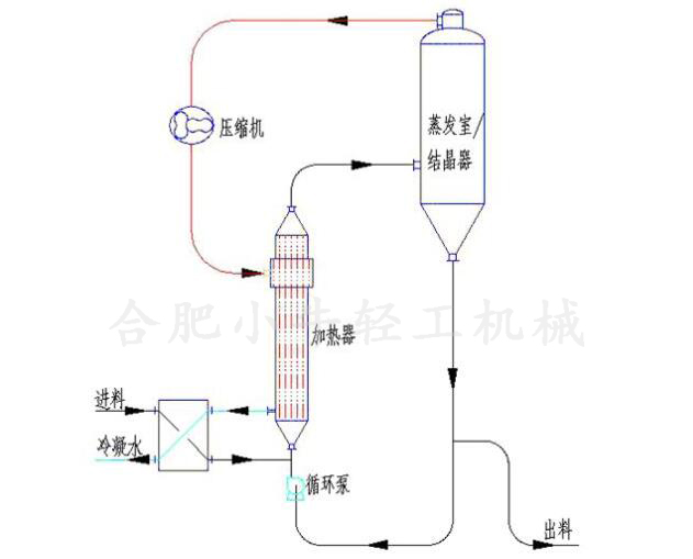 物料在加熱器的管程內(nèi)被殼程的蒸汽加熱溫度升高,在循環(huán)泵作用下物料上升到分離器中,在分離器內(nèi)由于物料靜壓下降使物料發(fā)生蒸發(fā)。蒸發(fā)產(chǎn)生二次蒸汽從物料中溢出,物料被濃縮產(chǎn)生過(guò)飽和而使結(jié)晶生長(zhǎng),解除過(guò)飽和的物料進(jìn)入強(qiáng)制循環(huán)泵,在循環(huán)泵作用下進(jìn)入加熱器,物料如此循環(huán)不斷蒸發(fā)濃縮或濃縮結(jié)晶。晶漿從循環(huán)管路中用出料泵輸出。蒸發(fā)分離器內(nèi)的二次蒸汽經(jīng)過(guò)蒸發(fā)分離器上部的分離和除沫裝置凈化后輸送到壓縮機(jī),壓縮機(jī)把二次蒸汽壓縮后輸送到加熱器殼程用作蒸發(fā)器加熱蒸汽,實(shí)現(xiàn)熱能循環(huán)連續(xù)蒸發(fā)。